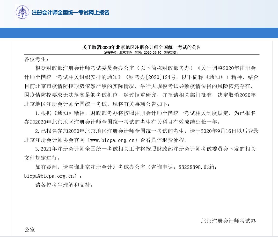 就在初级和中级考完没几天的功夫,北京注册会计师协会突然宣布,取消2020年北京注册会计师考试!消息一经发出,网站访问人数过多,崩掉了,但是没过几分钟就修复了。