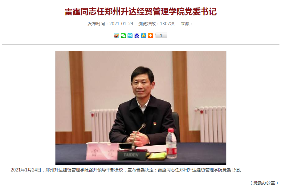 雷霆任郑州升达经贸管理学院党委书记