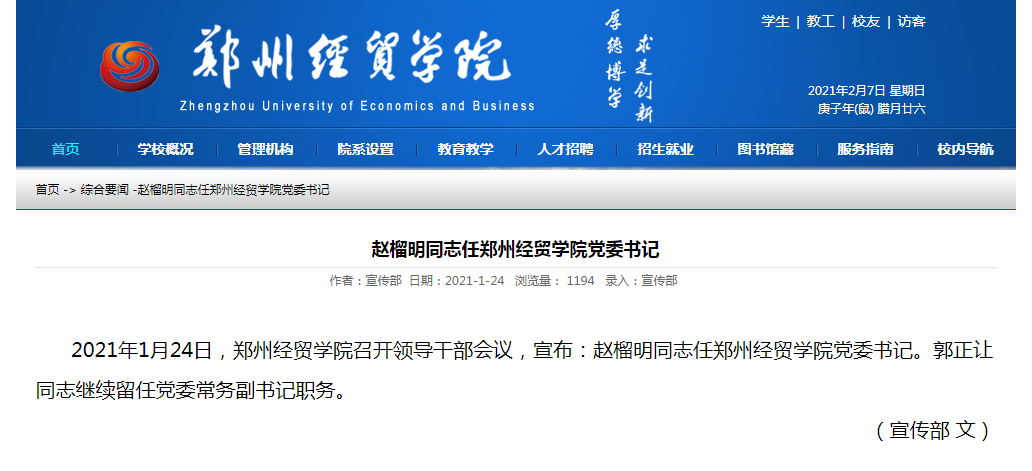 赵榴明任郑州经贸学院党委书记