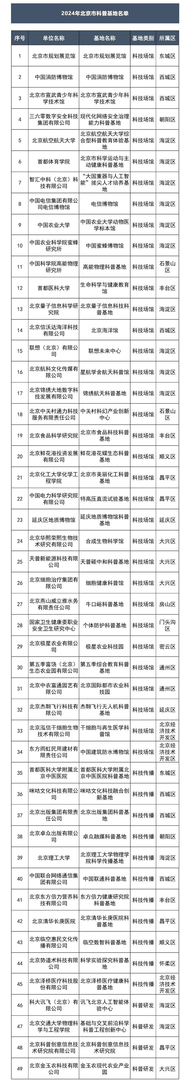 日前,北京市科学技术委员会、中关村科技园管理委员会和北京市科学技术协会共同组织开展了2024年度北京市科普基地申报工作,经形式审查、专家评审、现场踏勘和社会公示,中国科学院高能物理研究所、北京量子信息科学研究院等49家单位命名为北京市科普基地,命名周期为2024-2026年。