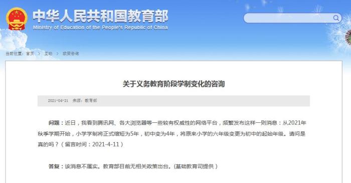 问题:近日,我看到腾讯网、各大浏览器等一些较有权威性的网络平台,频繁发布这样一则消息:从2021年秋季学期开始,小学学制将正式缩短为5年,初中变为4年,将原来小学的六年级变更为初中的起始年级。请问是真的吗?