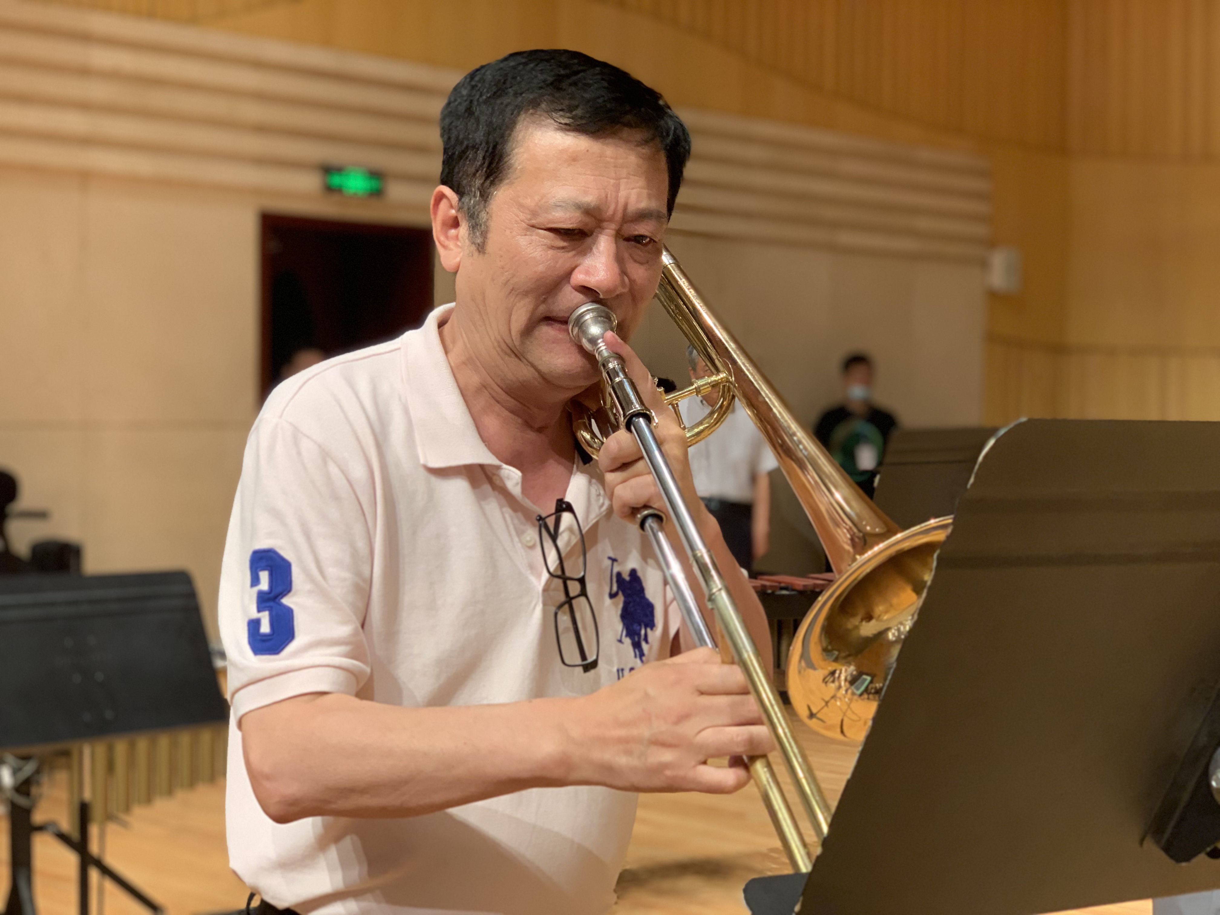河南省低音铜管研究会会长刘世桥正在进行彩排
