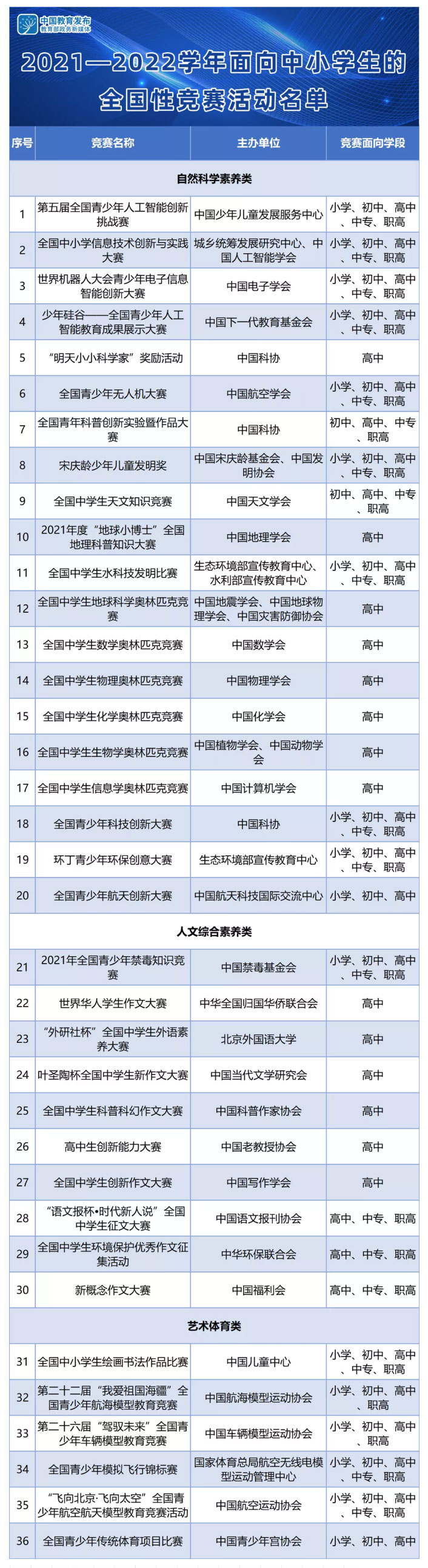 原标题:速递!教育部公布36项2021-2022学年面向中小学生的全国性竞赛活动名单